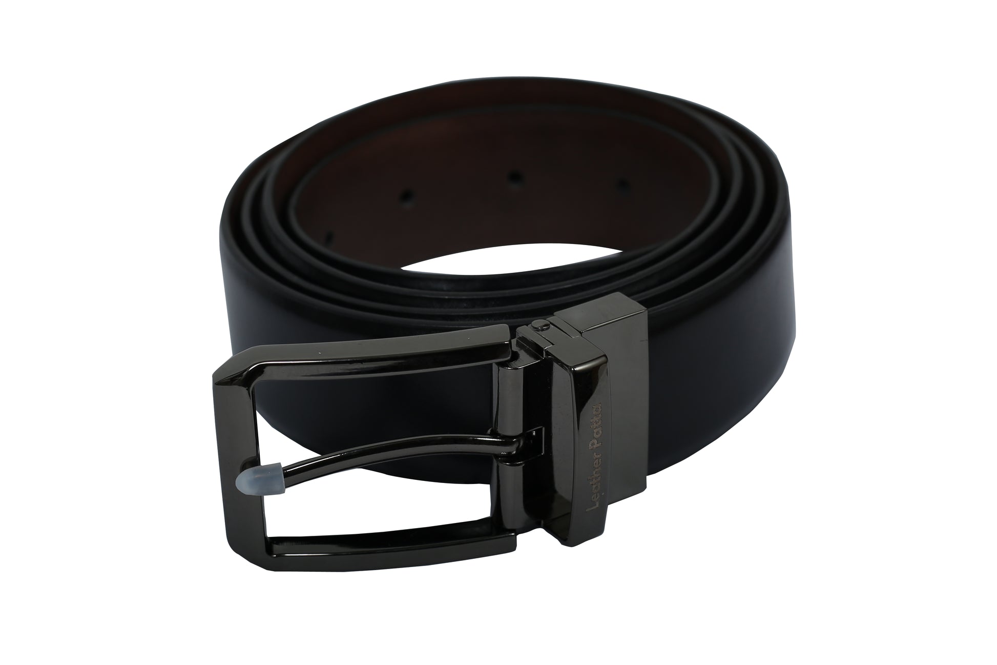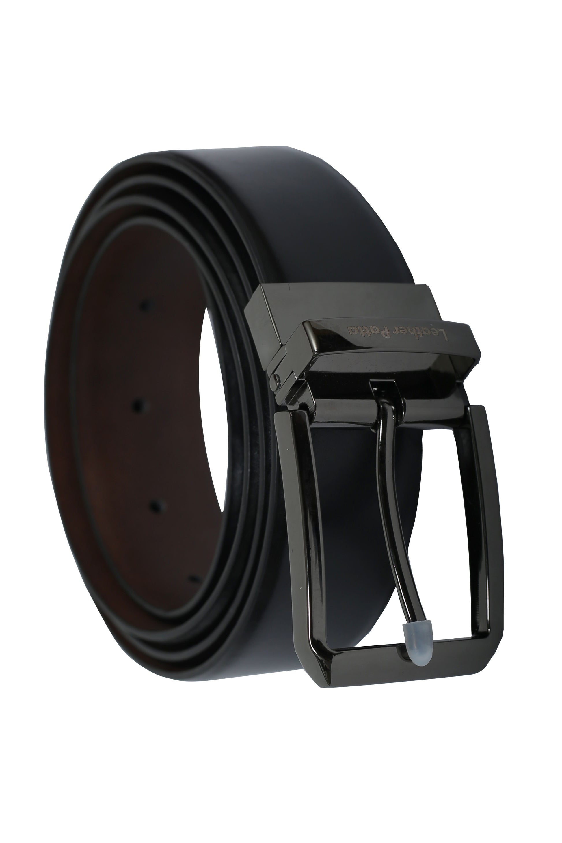 Switch between black and brown with ease with this Premium Reversible Leather Belt from Leather Patta. The textured leather finish gives a rich, professional appearance, and the chrome-finish buckle adds a sleek, polished touch.